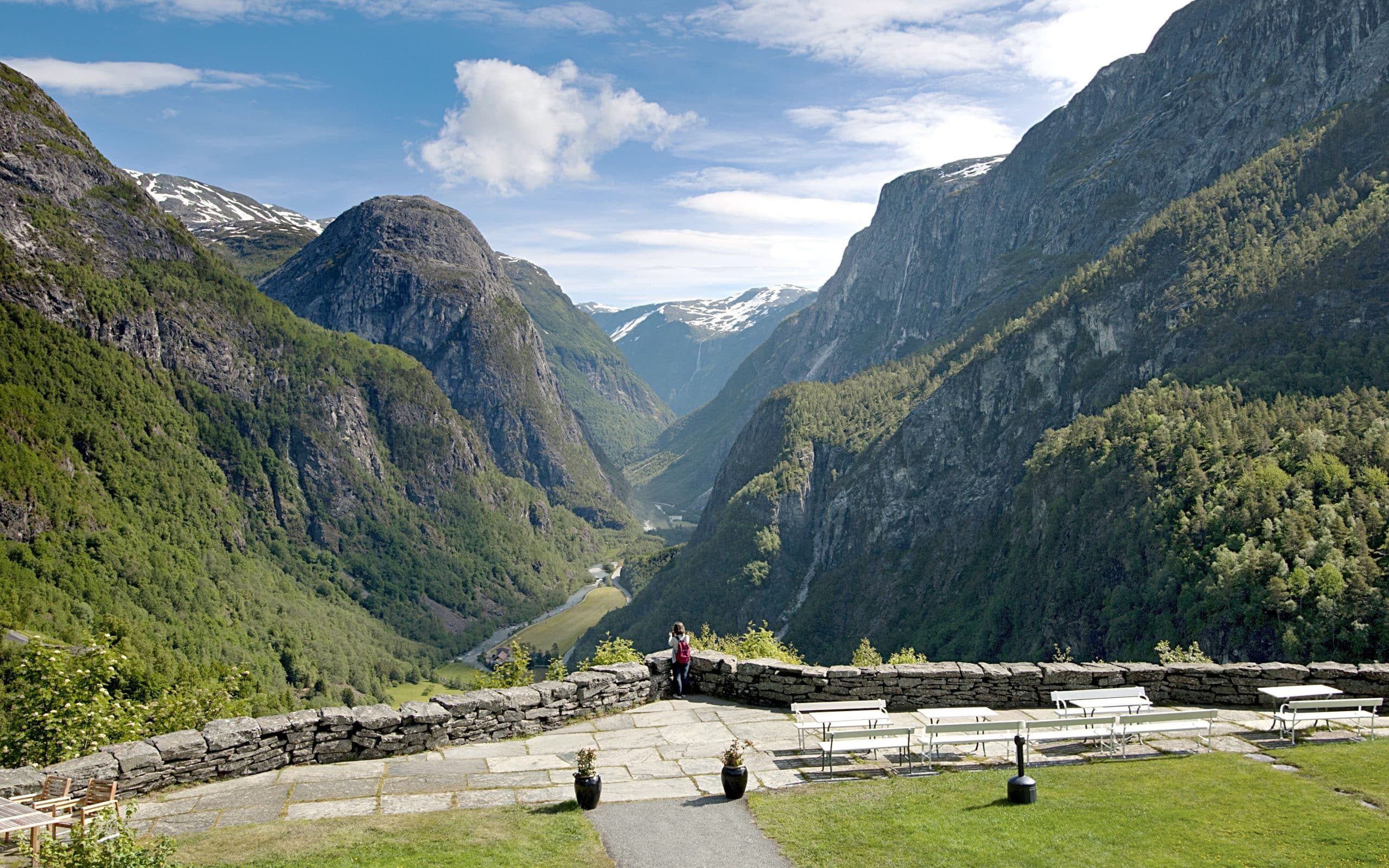 Flam ist ein typisches Fjord-Dorf, eingepfercht zwischen Felswänden, die steil zum Meer hin abfallen, mit einer einheimischen Bevölkerung, die sich auf überschwängliche Gastfreundschaft versteht. Die Tour beginnt mit einer Fahrt in einem Zug, der genau genommen kein Zug, sondern eher eine Mischung aus einer Zahnrad- und einer Gondelbahn ist, zwischen Fels, Fjord und Meer. In der Tat handelt es sich hierbei schlichtweg um eine Meisterleistung moderner Technik. Das Ganze spielt sich in 800 Meter über dem Meeresspiegel ab. Atemberaubende Ausblicke sind garantiert.